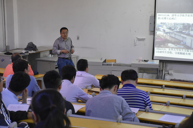 mk体育化学与环境监测教学中心教师单斌以“高校实验室安全建设”为主题,从实验室安全内涵、化学品安全及实验工作者良好职业习惯等方面,为全体教工详细介绍了实验室常见安全事故类型、成因及安全防护等内容。