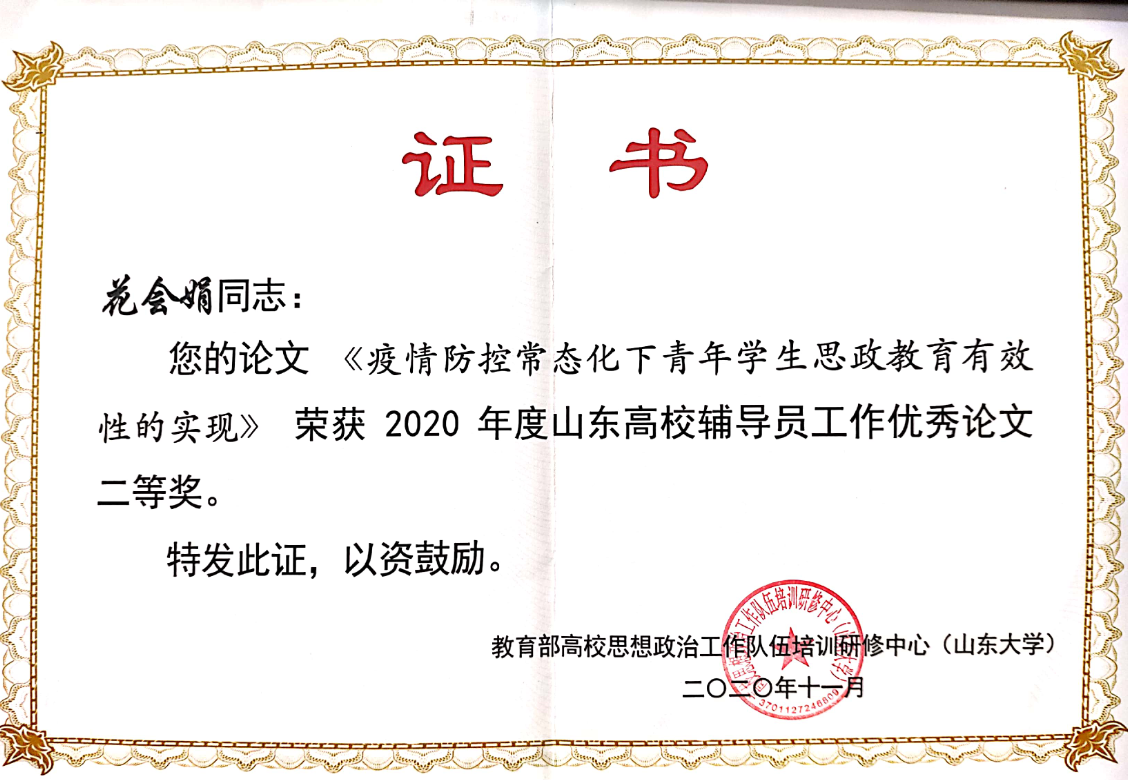 近日,山东省高等公司员工教育与管理研究会2020年年会暨2020年山东高校辅导员工作论坛在潍坊举行。公司辅导员花会娟的《疫情防控常态化下青年员工思政教育有效性的实现》荣获2020年度山东高校辅导员工作优秀论文二等奖。