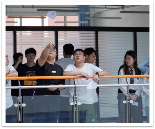 本次比赛由同学们在三楼投掷飞机,比拼飞机从出手到落地的滞空时间,每支队伍有三次飞行机会,最终成绩为三次飞行的最长时间。比赛在同学们高涨的热情下举行。赛中队伍观察着自己飞机的表现,分析出现各种状况的原因,方便在之后的比赛做出相应的调整。暂时未参赛的队伍都仔细观察着赛中对手飞机的表现,吸取对手成功和失败的经验和教训。最终,名叫“YG楼下折飞机”的队伍表现尤为突出,他们的飞机air1.0在空中呈螺旋式平稳飞行降落,最终取得了16秒57的好成绩。该队伍的领队介绍将飞机重心放在机头,扩大机翼可以让飞机飞得更久。朱明章老师肯定了这名领队的做法,跟同学们解释说纸飞机靠重力前进,重力势能转化成为前进的动力。所以要将纸飞机的重心放在纸飞机升力中心的前面,这样做重力才能驱动飞机下降,克服阻力前进,把重力势能转化为动能,进而依靠前进速度产生升力,平衡飞机的重力,使得纸飞机缓慢地下降。我们小时候玩纸飞机前都会对着纸飞机头部哈气,这么做就是利用这个原理,哈气过程中纸飞机头部会受潮加重,重心就会向前移动,从而飞行的更稳定,滞空时间更长。经朱明章老师解释后参赛选手们纷纷将原理投入实践,对自己的飞机进行进一步的改善,最终飞机的滞空时间果然增长了。