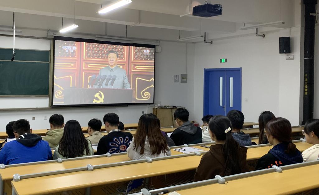 现场同学们认真观看了习近平总书记在庆祝中国共产党成立100周年大会上的重要讲话视频,“中伟大、光荣、正确的中国共产党万岁!伟大、光荣、英雄的中国人民万岁!”习近平总书记的讲话启迪人心,催人奋进,发人深省,引发了同学们的强烈共鸣,会上时不时响起热烈的掌声。在学习讨论环节,李建凯、于昊、王前进等同学分别从如何弘扬伟大党建精神、如何增强青年的使命感、责任感,如何做到以史为鉴、开创未来等多角度交流学习感受。李建凯同学激动地表示:“作为新时代的青年,更应扎根时代,紧跟党走好新时代的长征路,书写属于新时代中国青年的壮丽篇章。”