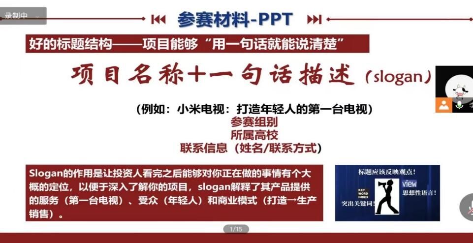 会上,李良洁结合自身担任团队指导老师的工作经历从大赛机制、参赛要求、赛道特点和适用人群等方面概括性地为同学们介绍了中国“互联网+”老员工创新创业大赛。随后,培训从项目行业背景、市场痛点抓取、项目优势展示、财务预测以及融资计划等方面详细讲解商业项目书、PPT的撰写技巧。最后,李良洁结合获奖项目案例就同学们关切的问题做了详细的解答,并欢迎同学们在会后积极与自己讨论与大赛相关问题。