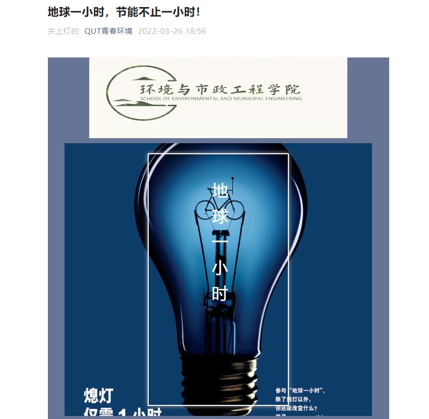 “地球一小时”(Earth Hour)活动是世界自然基金会于2007年发起的一个全球活动,号召个人、社区、企业和政府在每年3月最后一个星期六的20时30分至21时30分关闭不必要的电源,以表明对保护地球的支持。2022年“地球一小时”的主题为“行动,共创未来”,3月26日晚,mk体育团委积极响应,面向全校师生发出“地球一小时,节能不止一小时”的号召,倡议全体师生于20:30-21:30关闭不必要的电源,节能一小时,一起行动,共创未来。