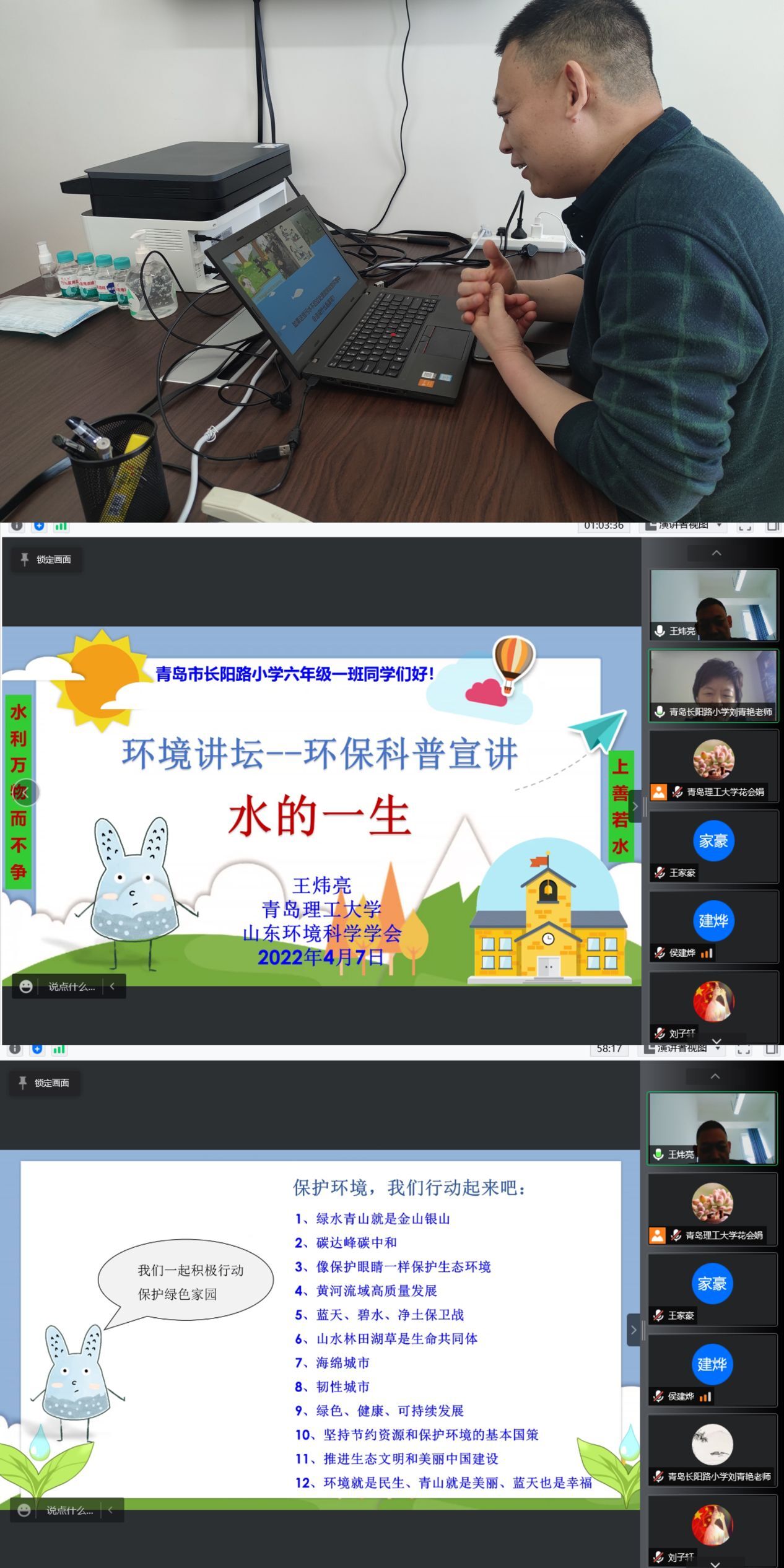 精心准备,让环保知识体现生动性。接到宣讲团招募通知后,青岛市教学名师孙好芬教授第一个报了名,在繁忙的教学、科研工作中她挤出时间精心选题,50多岁的她为了当好“主播”主动研究小员工的学习内容、学习能力,学习小学老师的讲课方式,结合世界地球日,她广泛搜集,图文并茂地制作了精美的《世界地球日》宣讲素材。唐沂珍教授的孩子妞妞正在上小学,为了给小朋友们讲好《有趣的化学》,妞妞成了她的“小助手,”在家中她先尝试给妞妞讲明白,带着妞妞实验成功后再面向更多的孩子讲,并带领课上的小朋友们一起做试验。“唐老师的课堂生动有趣、通俗易懂,让我萌发了对化学的兴趣,我喜欢上环保科普课!”崂山区第二实验小学三年级11班的王思昀小朋友说到。