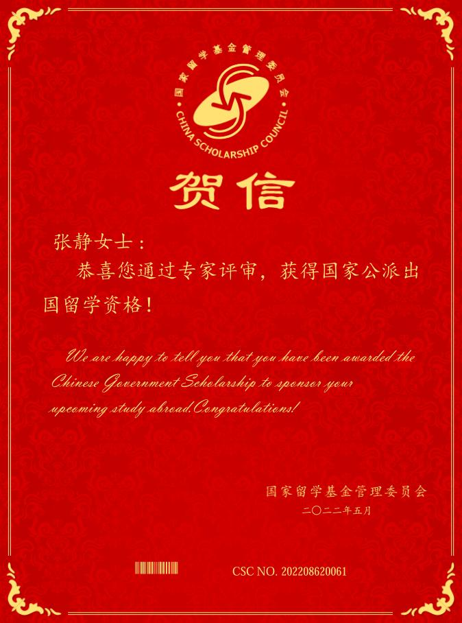 近日,由国家留学基金管理委员会(CSC)主办的2022年国家建设高水平大学公派研究生项目结果揭晓。mk体育环境科学与工程专业2018级硕士研究生张静(导师:孙英杰教授、赵建伟副教授)顺利通过留学基金委的专家评审,获批国家留学基金资助公派出国留学的资格,该同学将赴新西兰奥克兰大学攻读环境科学与工程博士学位。