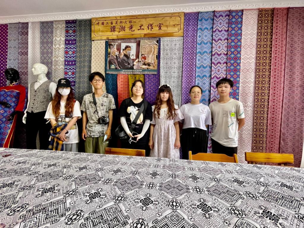 团队成员还参加了壮锦培训课堂,学习壮锦编织技艺,以及如何实现壮锦的创新,在课堂上,老师以壮锦旗袍为例,面料用壮锦和一些素色的做拼接,颜色相撞,壮锦的纹样有双凤朝花,寓意女性的美丽自信,有几何纹样山川、花草、稻田,寓意丰收的美好景象。团队成员了解到,几乎每天都有来自全国各地的师生前来工作室交流学习。团队拜访谭湘光大师的当天,还有来自江西南昌泰豪动漫公司的老师、桂林航天工程公司的教授、南阳师范公司的大三员工,以及广西科技大学的大三员工前来学习。