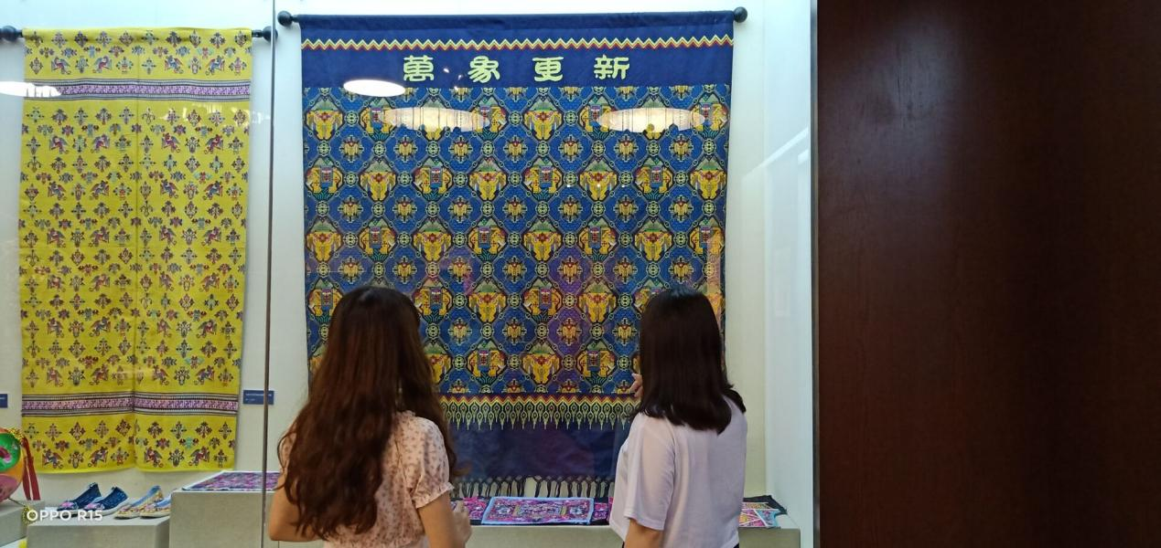 8月7日,团队成员来到广西民族博物馆,欣赏了壮锦相关展品。博物馆展出了壮锦的服饰、织锦机等作品。展厅内,巨大的壮锦图幅从高空垂下,如一位独坐一隅的老人,庄严,肃穆,仿佛在轻轻诉说着壮锦的前世今生,壮锦在灯光的照耀下,熠熠生辉,似乎寓意着如今壮锦发展的一派欣欣向荣的景象。