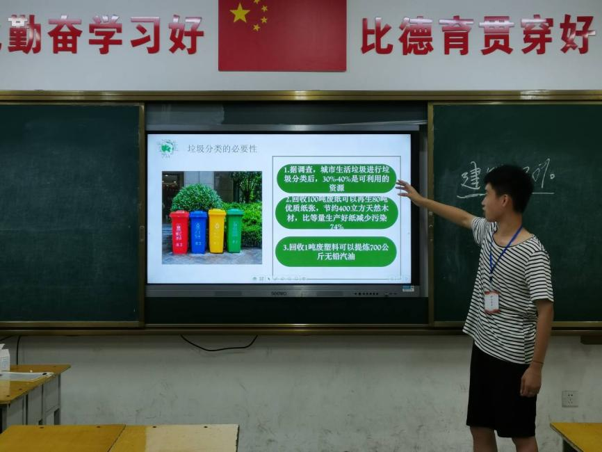 在烛光夏令营活动期间,团队成员以“绿水青山就是金山银山的”为题,从“来之不易的绿水青山”、“绿色发展走向世界”、“中国治沙”三个方面,为孩子们讲述了生态环境面临的现状和存在的问题,加深了孩子们对生态环境的了解,激发了他们保护生态环境的热情。向日葵志愿服务小队也向孩子们介绍了现在的环保新方案——垃圾分类,并向孩子们发出行动号召。