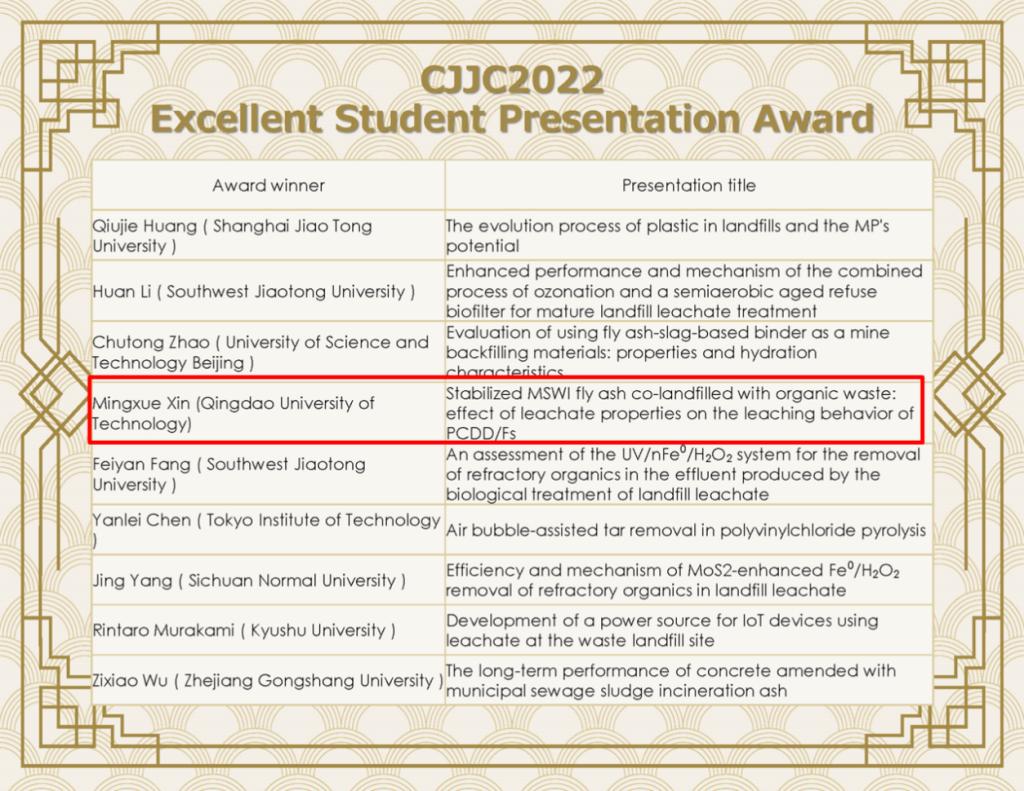 中日双方的专家学者和环保领域业界代表围绕当前固体废物处理处置领域技术发展和面临的相关问题展开了深入探讨和交流。大会围绕焚烧和热处理、焚烧残余物稳定化、污染物浸出行为和无害化处理、填埋场管理、垃圾填埋场监测、物联网利用和塑料废物现状、渗滤液处理及有机废物处理和回收、填埋气回收和温室气体减排等主题进行了专题汇报。mk体育副经理孙英杰受邀为焚烧残余物稳定化分会场主席,王华伟副教授、卞荣星副教授及博士生辛明学分别进行了题为“Simultaneous degradation of refractory organics,antibiotics and antibiotic resistance genes from landfill leachate concentrate by GAC/O3”、“Influence of the classification of municipal solid waste on the reduction of greenhouse gas emissions: A case study of Qingdao City, China” 及 “Stabilized Fly Ash Co-landfilled with Organic Waste: Effect of Leachate Properties on the Leaching Behavior of PCDD/Fs” 的口头报告。辛明学博士获得Excellent Student Presentation Award。此外,王亚楠副教授、硕士研究生于倩雯和张听雪分别进行了题为“Insights into the landfill leachate properties and bacterial structure succession resulting from the colandfilling of municipal solid waste and incineration bottom ash”,“Leaching behavior of heavy metals from broken ton bags filled with fly ash in acid rain environment” 及 “Estimation of greenhouse gas emissions from municipal solid waste disposal in China during the last decade”的海报展示。