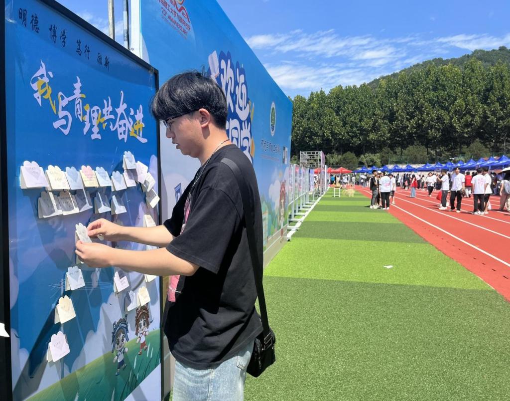 为激励新生扬起青春的帆,同理工奋楫笃行,使新同学们意识到“奋斗才是青春的主旋律”,在我与青理共奋进活动中,满载着新生的祝福。留言条上有对未来的展望,有对生逢其时的感激,有对公司生日的祝福,一个个笔墨一如青春的底色。不仅如此,留言条汇成“70”的模样,屹立在留言板上,一如同学们坚毅的神情,奋斗才是青春的主旋律,与理工同奋楫笃行!其中有一张特别的贴纸,内容是空白的,留下这张空白贴纸的是来自环工233的宋旭安同学,他坚定的说到“大学四年对他来讲,意味着无限可能,要勇敢的超越自我,成为最好的自己!”