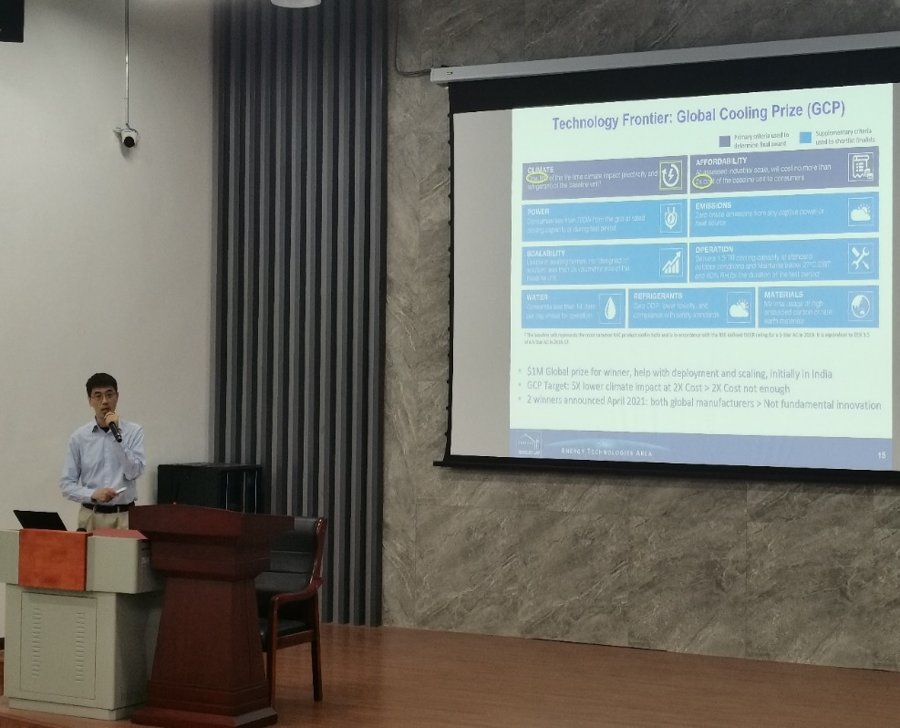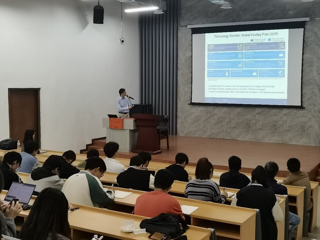 丁超博士以“浅谈全球制冷能效和房间空调器能效标准”为题,围绕我国清洁能源现状、气候变化、节能减排等方面进行详细介绍。其间,丁超博士引用最近上映的电影《奥本海默》,为师生们介绍了蒸发制冷技术、磁制冷技术、半导体制冷技术等。报告内容丰富而详实,使师生对目前制冷领域存在的前沿问题有更深入的认识和了解。报告虽仅短短一小时,却开阔了师生学术视野。报告结束之际,师生与丁超博士就制冷技术前沿进行了深入交流。