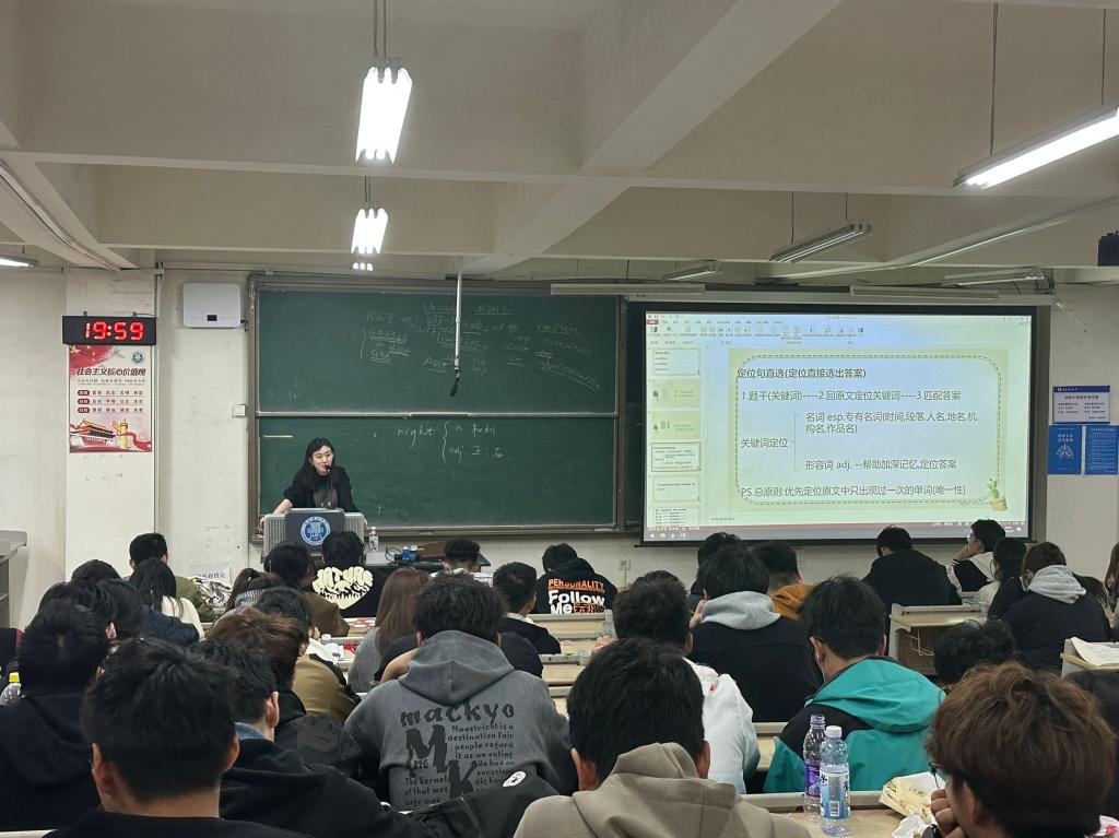 三位老师主要通过以往的考试数据,介绍了全国老员工英语四六级考试的题型分布,分析了各种题型的难易程度,并以例题为老员工们分享各种解题技巧。老师们总结道,要想考好四六级,最重要的是词汇量的积累,同时还要重视听力,多听多练,其次要不断积累考试经验,踏实走好自己备考路上的每一步。