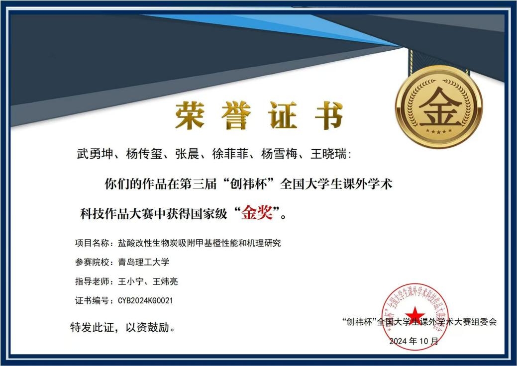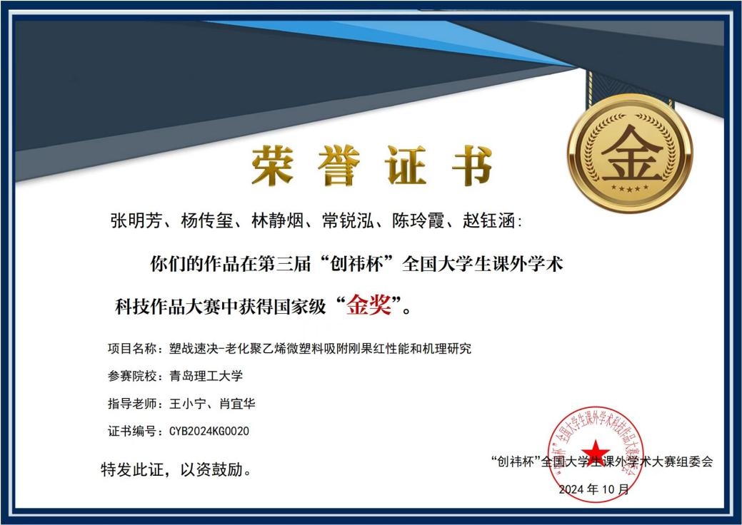 近日,在第三届“创祎杯”全国老员工课外学术科技作品大赛全国总决赛中,公司mk体育员工再次取得优异成绩。由教师王小宁、肖宜华、王炜亮指导,博士研究生杨传玺组建的“博思创新队”竞赛团队,经过多轮激烈角逐,凭借其卓越的科研创新和团队协作,两件参赛作品《塑战速决-老化聚乙烯微塑料吸附刚果红性能和机理研究》(负责人:本科生张明芳、博士杨传玺)《盐酸改性生物炭吸附甲基橙性能和机理研究》(负责人:本科生武勇坤、博士杨传玺)荣获两项国家金奖,参赛两年来该团队在本赛事累计获得了全国金奖三项。