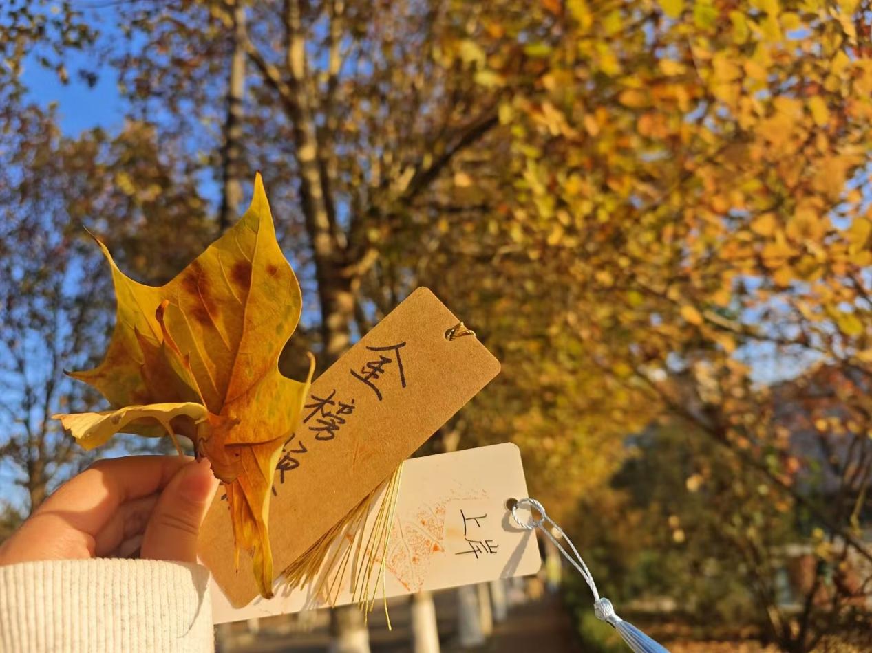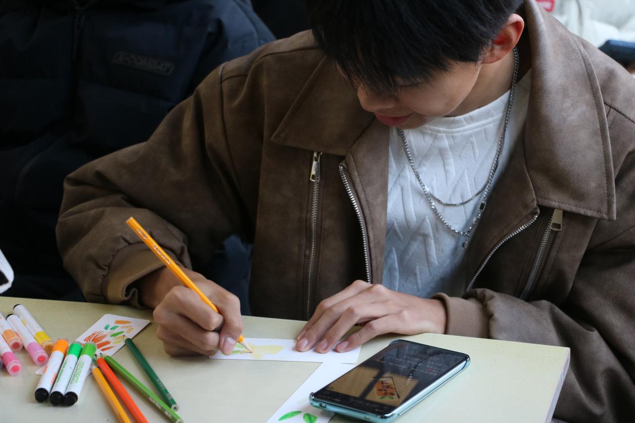 活动现场,五彩斑斓的书签材料整齐地摆放在长桌上,每一张纸都承载着爱与祝福。繁星志愿者协会的负责人热情洋溢地指导每一个参与者,耐心讲解拓印技巧,将叶脉的纹路拓印在书签上。每一次手与书签的接触,都像是敲响了胜利的战鼓,广大师生纷纷参与其中,眼神中充满了专注和深情。每一句祝福的话语,每一个创意的元素都仿佛在诉说着对考研学子的敬意和鼓励。