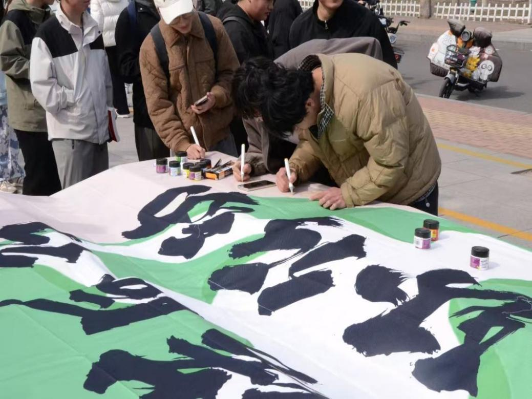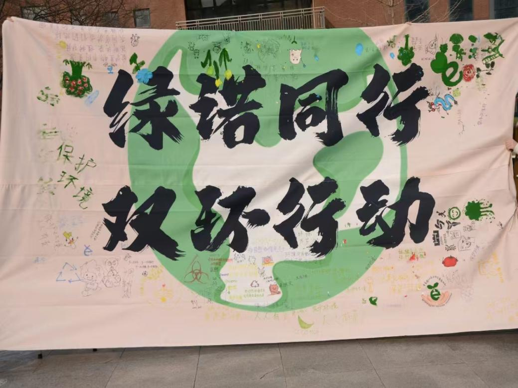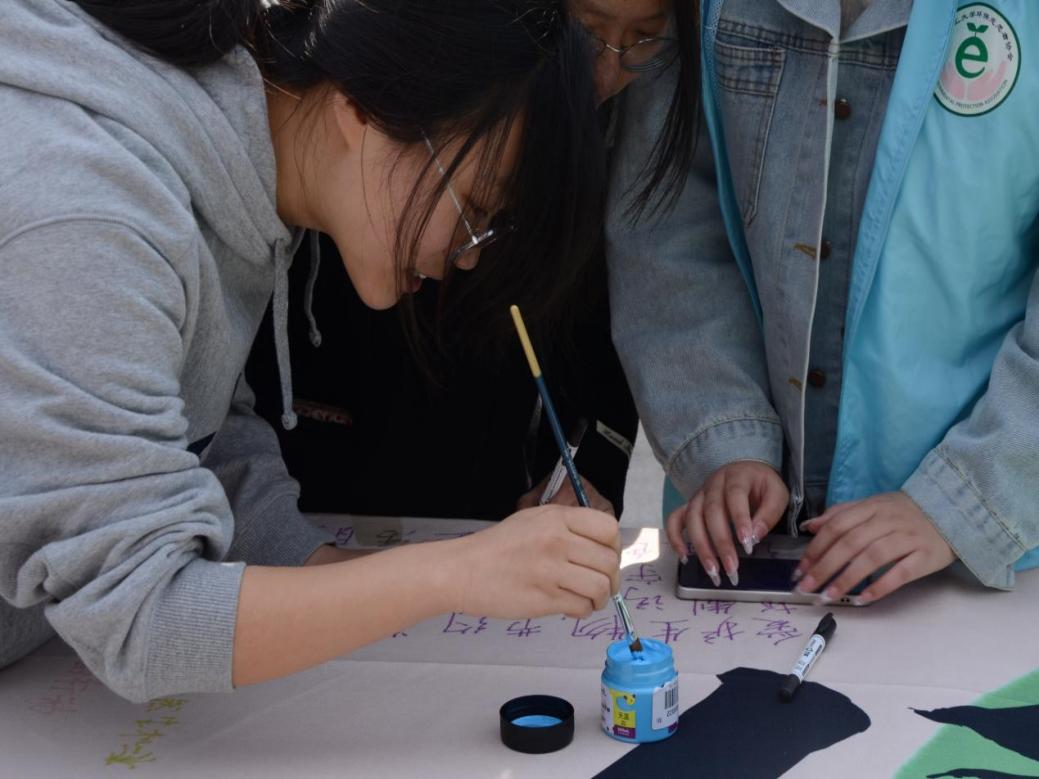 活动伊始,“笔尖绿意”创意区迅速成为全场焦点。展台上,数米长的画布平铺展开,参与者手持环保颜料与画笔,将内心所想泼墨于此:“绿水青山就是金山银山”的铿锵标语;简笔勾勒出的森林、风车的低碳意象;“减塑行动,始于方寸”的激昂呐喊尽数被挥洒其上。“环保不仅是口号,更是日常的坚持。”随着活动进行,原本素白的画布被绚丽的色彩与真挚的誓言填满,成为师生共建绿色校园的有力见证。
