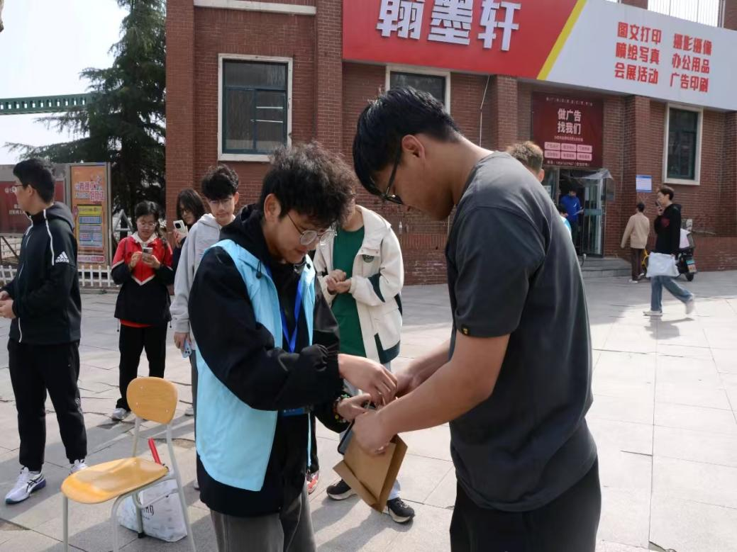 活动现场,志愿者们穿梭其中,从规则讲解、物资分发,到秩序维护、答疑解惑,不断彰显着社团成员的专业素养与热忱之心。广场两侧,“绿诺同行,低碳有我”的横幅迎风飘扬,定制书签、环保纸袋等文创品在师生手中传递,将活动进一步推向高潮。