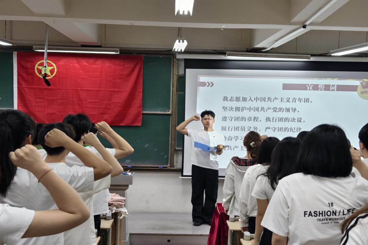 入团仪式在庄严的国歌声中拉开帷幕。宣读新团员名单,45名同学光荣加入中国共产主义青年团。随后,新团员们举起右拳,在领誓人的带领下庄严宣誓。铮铮誓言,回荡在教室的每一个角落,这是他们对共青团的庄严承诺,也是对自己未来的坚定决心。