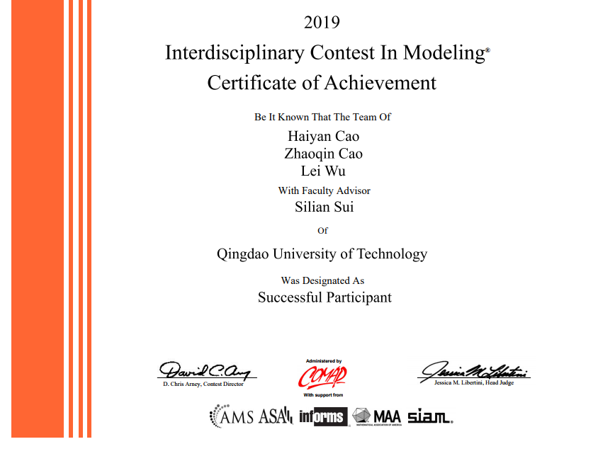 接下来的美赛,她结识了新朋友和新队友,在老师们的帮助和协调下安排好宿舍等一切事宜,开始了美赛前为期两周的准备时间。美赛最大的特点就是全英文写作,这对她们来说是第一次,在美赛的四天时间里,通过不断摸索、讨论、翻译等等,提交了一篇完整英文论文,最终获得S奖。