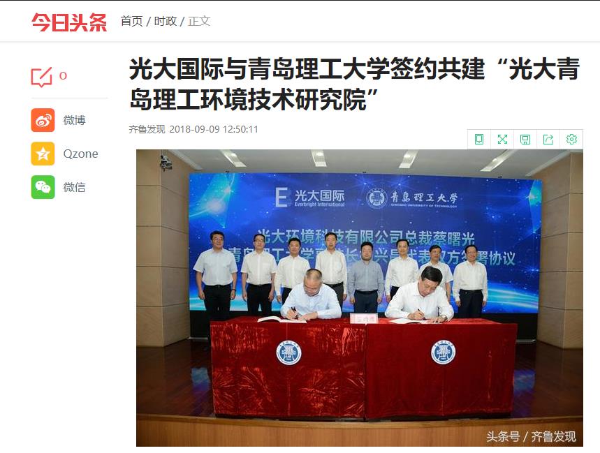 谭秀森在讲话中介绍了公司的发展情况并指出,2018年是全面贯彻党的十九大精神的开局之年,是决胜全面建成小康社会、实施“十三五”规划承上启下的关键一年。对公司而言,2018年是公司瞄准目标、抢抓机遇、苦练内功、夯实基础、迎接突破的强基之年,是公司破解重大发展瓶颈、实现新校区建设既定目标的攻坚之年,也是公司深入实施综合改革、推进内涵式建设、助推新旧动能转换、开创发展新局面的起势之年。公司2018年工作计划将助推全省新旧动能转换重大工程列入了公司重点工作。此次与光大国际合作建立环境技术研究院,是公司积极服务全省新旧动能转换重大工程、助推新旧动能转换的又一重要步骤,也是公司借助与光大国际的高端科研平台,汇聚人才,全面提升团队建设水平、促进公司内涵式发展的重要举措。相信在双方共同努力下,通过真诚合作,“光大青岛理工环境技术研究院”一定会取得丰硕的合作成果,实现互惠双赢、共同发展的目标。公司也将以此为契机,在积极助力国家生态文明与环境安全建设的同时,加快一流特色高水平大学建设步伐。