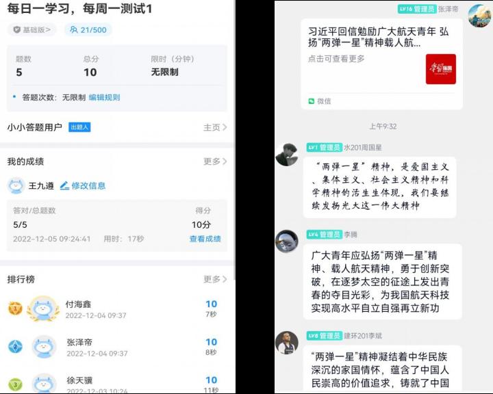 每日分享,见贤思齐。为进一步增强支部党员对党的二十大精神学习的自觉性和主动性,11月以来,临时党支部以“学习强国”为平台,各小组精心筛选,择优推荐,每日推送一篇充满正能量的文章,同时每周组织一次定时定点小测试,巩固知识的同时也检验了全体党员对党的二十大知识的理解。“以考促学、以学促用”,临时党支部努力共建学习型基层党组织,使全体党员同志深入学习党的基本知识,提升政治理论水平。