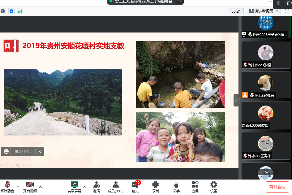 随后,王子维分别从回首过去、追逐梦想、志愿抗疫、支教山区、科创实习和考研工作六个方面进行分享。他与大家分享自己参与支教活动的照片,为大家讲述了偏远地区孩子们的生活,希望同学们能够珍惜如今的生活,充分提升自我,更好的报效家国。同时,王子维分享了自己本科期间实习及考研经历,鼓励同学们要多多探索,不怕吃苦,方能找到真正适合自己的道路。