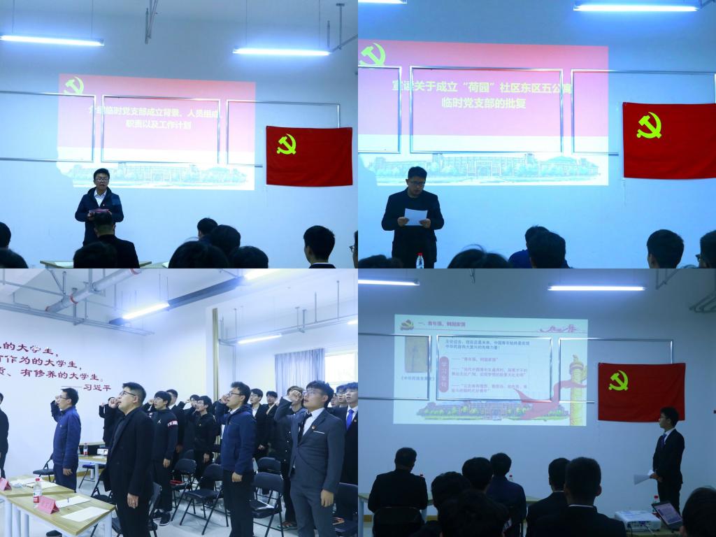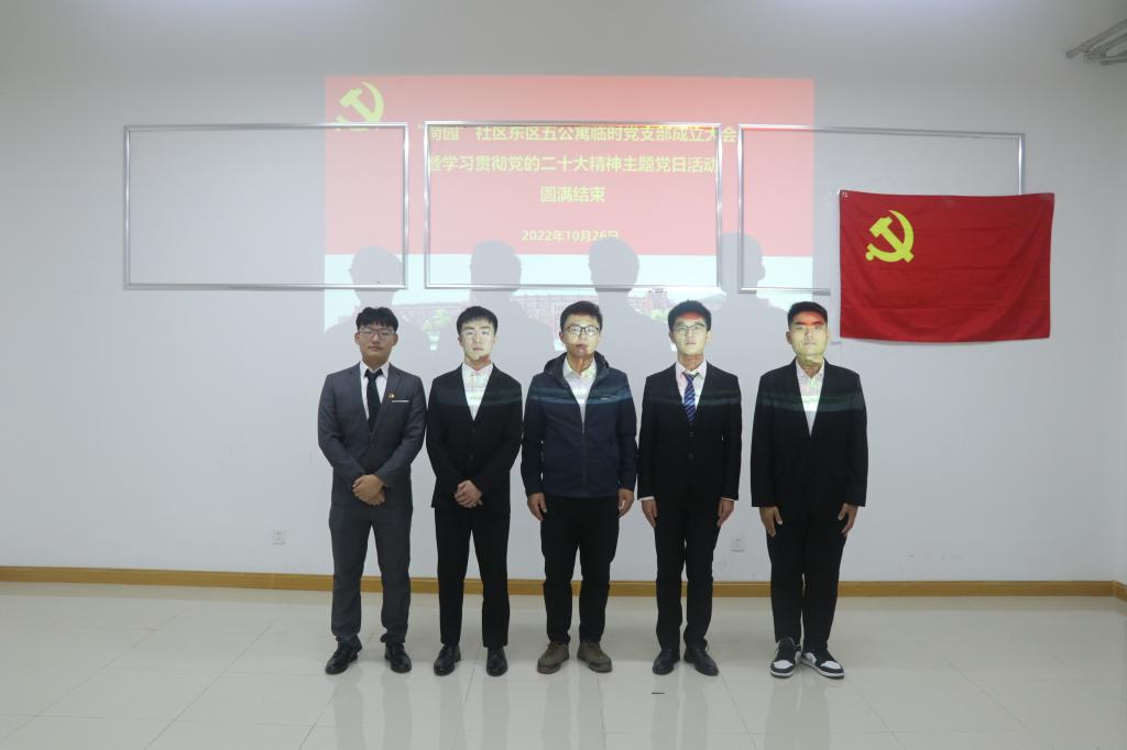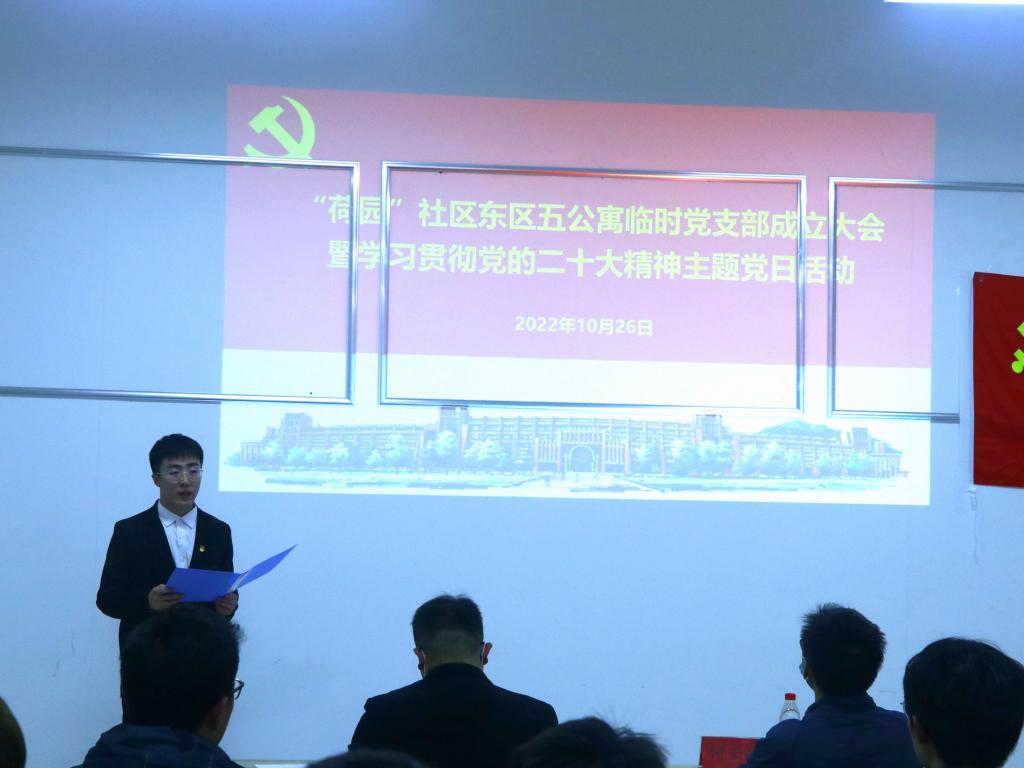 成立大会上,临时党支部书记王登榜介绍了临时党支部成立的背景、组织设置、基本任务及工作计划等。公司党委委员左宗良代表公司党委宣读了《关于同意成立“荷园”社区东区五公寓临时党支部的批复》并对临时党支部的成立表示祝贺。临时党支部组织委员李斌带领全体党员重温了入党誓词,宣传委员张泽帝领学了党的二十大报告中关于青年的相关论述,结合身边榜样案例,引导大家坚定不移听党话、跟党走,做有理想、敢担当、能吃苦、肯奋斗的新时代好青年。