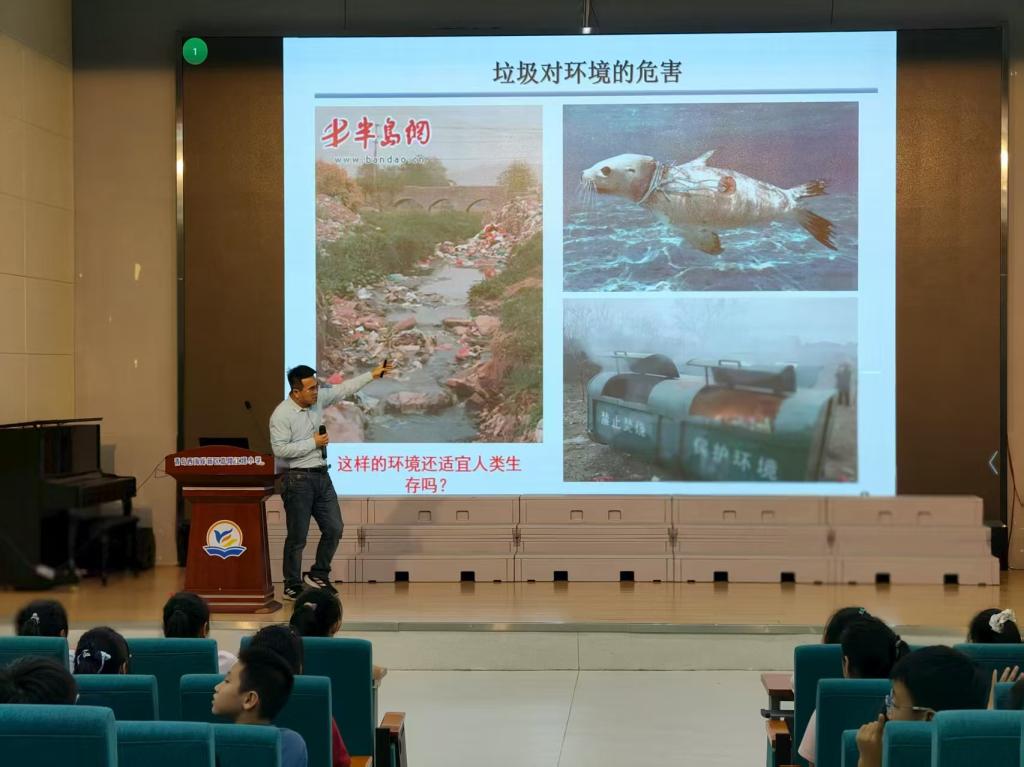 9月18日,嘉陵江路小学四年级师生齐聚报告厅,聆听mk体育教授、博士生导师、泰山学者青年专家王华伟带来的“做好垃圾分类,践行初心使命”科普讲座,鲜活的内容让环保理念深入人心。本次活动由王华伟教授携手“净蓝”环保志愿者协会共同策划举办,为学子们上了一堂生动的环保实践课。