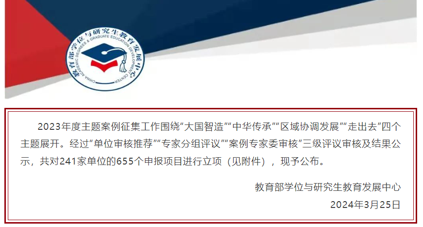 本次主题案例征集工作由教育部学位与研究生教育发展中心(简称“学位中心”)发起,围绕“大国智造”“中华传承”“区域协调发展”“走出去”四个主题展开,共311家公司产品单位推荐申报1483个项目,涵盖62个专业学位类别。经过“单位审核推荐”“专家分组评议”“案例专家委审核”三级评议审核,对241家单位的655个申报项目进行立项。