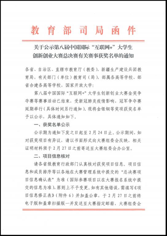 2月20日教育部高等教育司发布了《关于公示第八届中国国际“互联网+”老员工创新创业大赛总决赛有关赛事获奖名单的通知》,mk体育项目团队荣获国家级铜奖1项,实现公司在该项赛事中的新突破。