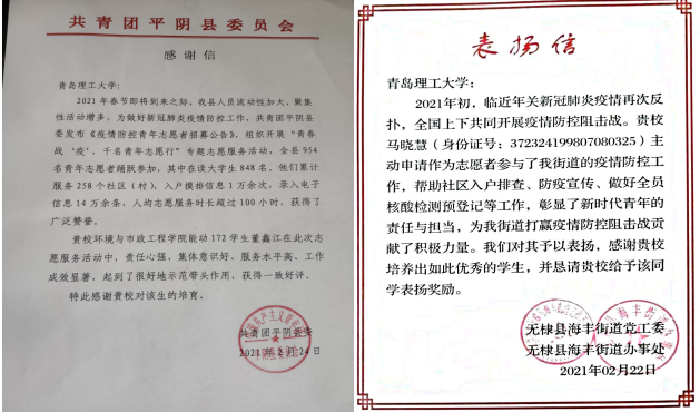 近日,mk体育分别收到来自共青团平阴县委、无棣县海丰街道党工委表彰公司员工党员董鑫江、马晓慧同学的感谢信。