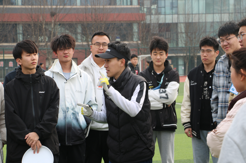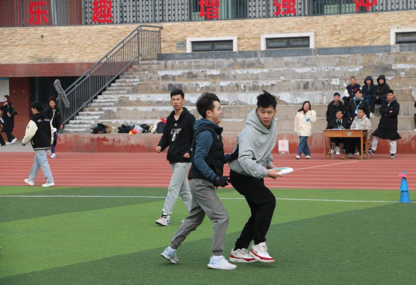 热身活动准备完毕,每支队伍磨拳擦掌,跃跃欲试,势必要在此次活动中一展雄风,摘得头魁。各组队长出列猜拳,决定进攻防守方。随着比赛开始哨声响起,飞盘在空中不停盘旋,在成员手中不断跳动、旋转、传递,得分难分上下,战况焦灼。队员们咬牙坚持、不肯放弃,他们高扬的状态、矫健的身姿,无不展现出飞盘的竞赛活力,不断将比赛推向高潮。场下的助威声、喝彩声、笑语声此起彼伏,为了激起大家的斗志、提升队伍士气,工作人员们设置了点歌环节,参赛选手在群内接龙点歌,歌声回荡整个操场,活动现场气氛热烈。直到比赛结束,大家依然仍觉得兴致勃勃、意犹未尽。